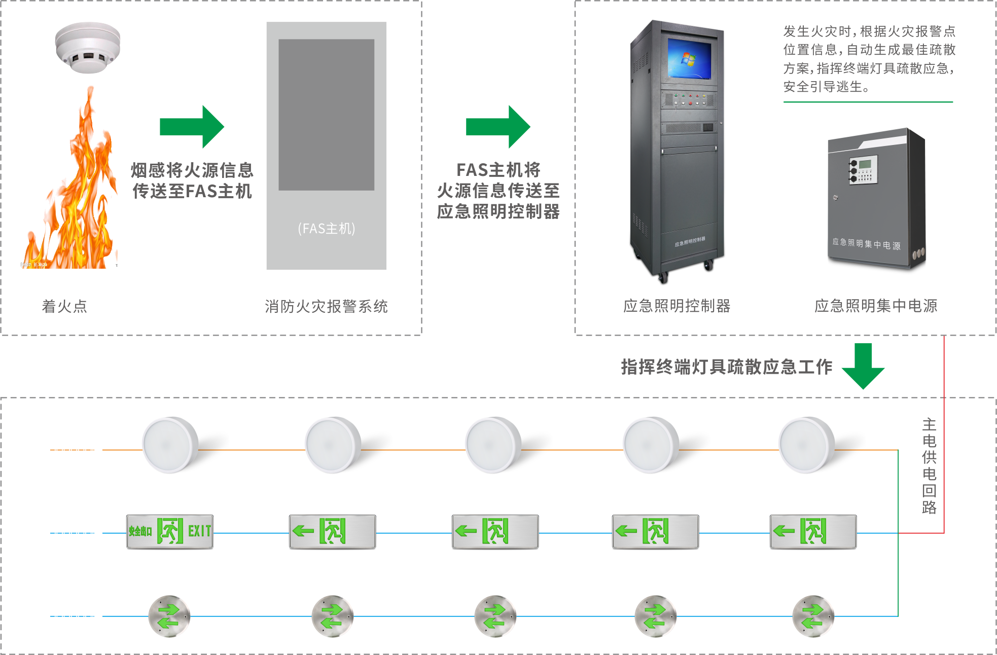“智能疏散系統”是由智能疏散系統控制主機、消防應急電源、消防應急標志燈具、消防火災報警主機,火災探測器等多種設備組成的一套智能消防疏散系統。該系統具有人機交互界面,可對應急標志燈具實時巡檢、并與報警主機系統聯動、在有火災發生時,根據起火位置智能選擇最佳逃生路線進行疏散指示。