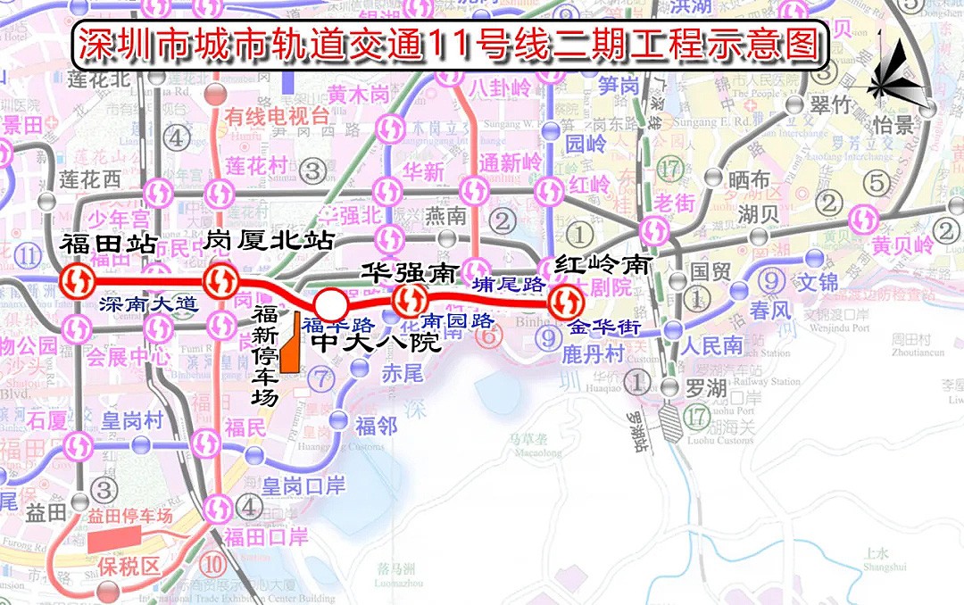 項目概況:深圳地鐵11號線二期起于崗廈北站(不含),主要沿深南大道、福華路、南園路、埔尾路、金華街敷設,止于紅嶺南站,線路全長約4.39千米,共設3座車站:中大八院站、華強南站、紅嶺南站,深圳地鐵11號線二期建成后,將進一步實現深圳東西向發展主軸中心間的快速通達,串聯起西部寶安區、南山區與東部羅湖區,實現城市主次中心的快速連接,助力建設軌道上的大灣區